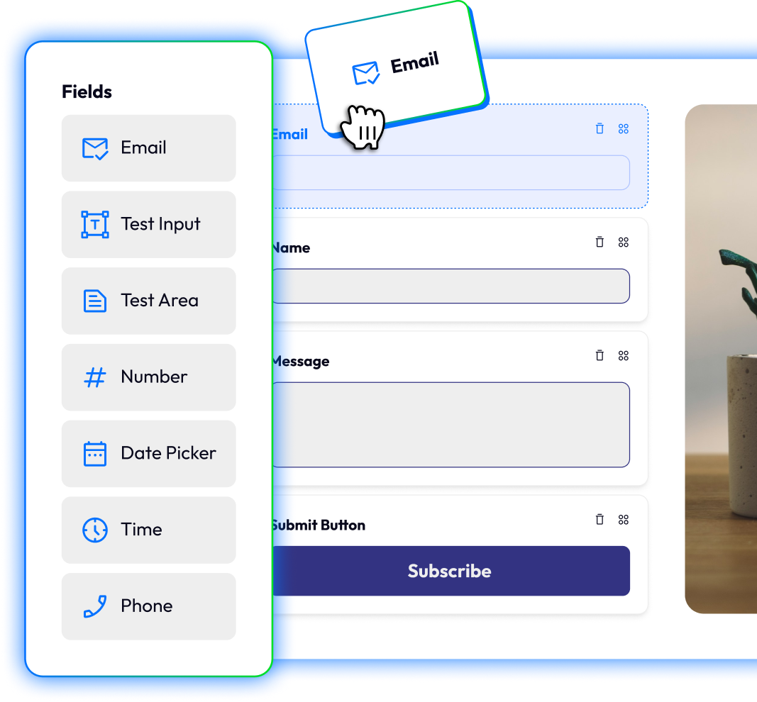 Our intuitive drag-and-drop builder lets you create custom forms quickly. No coding required—just click, move, and drop elements exactly where you want them for a polished, professional look.